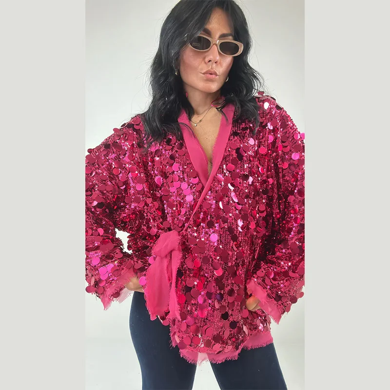 Women’s Big Sequins Lace-Up Coat – Stylish Long Sleeve V-Neck Loose Jacket for Autumn